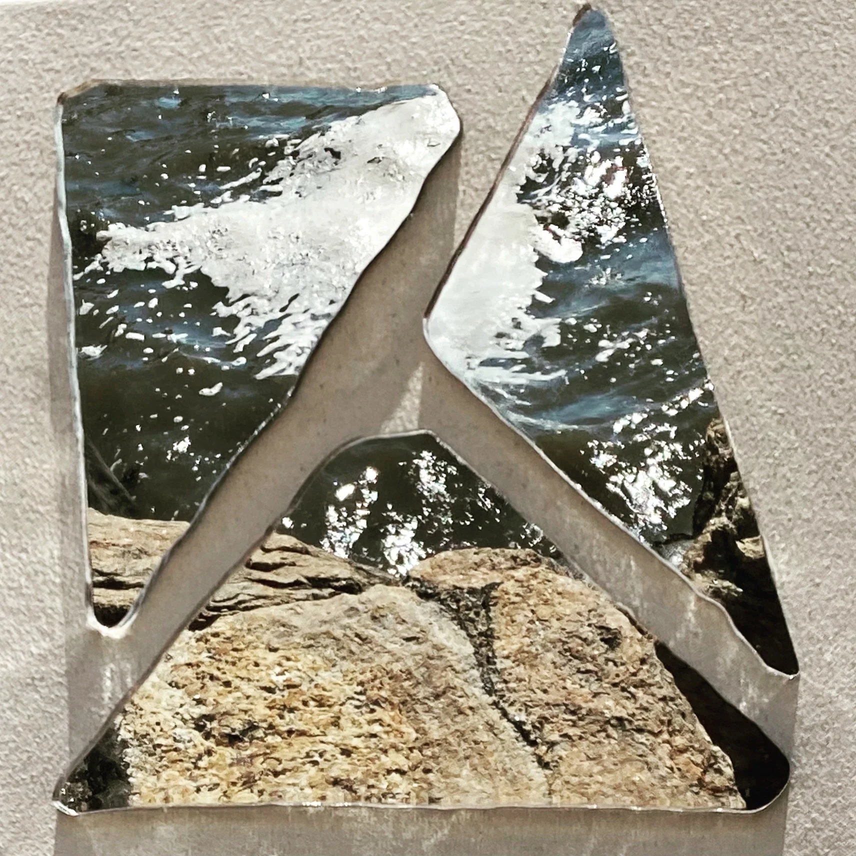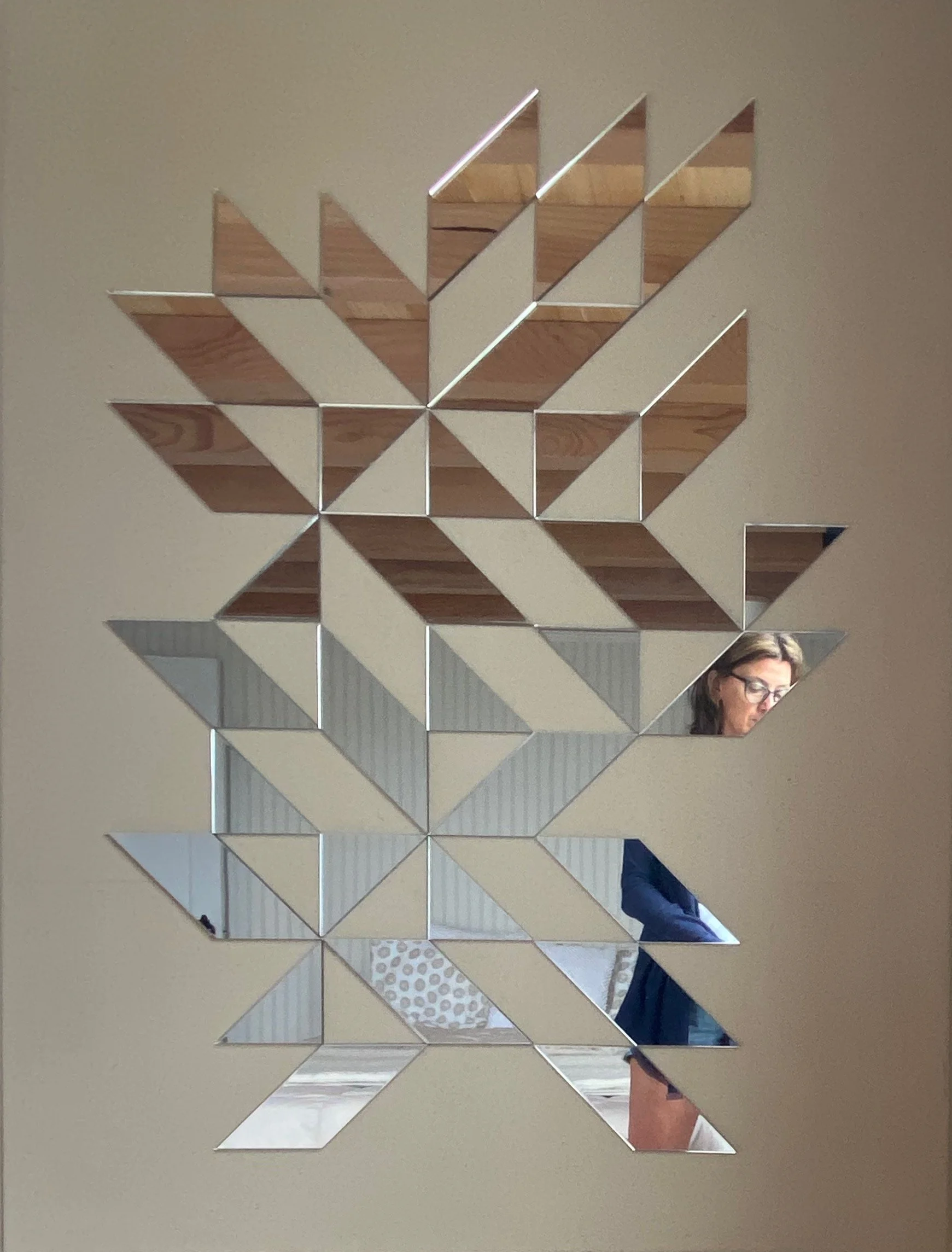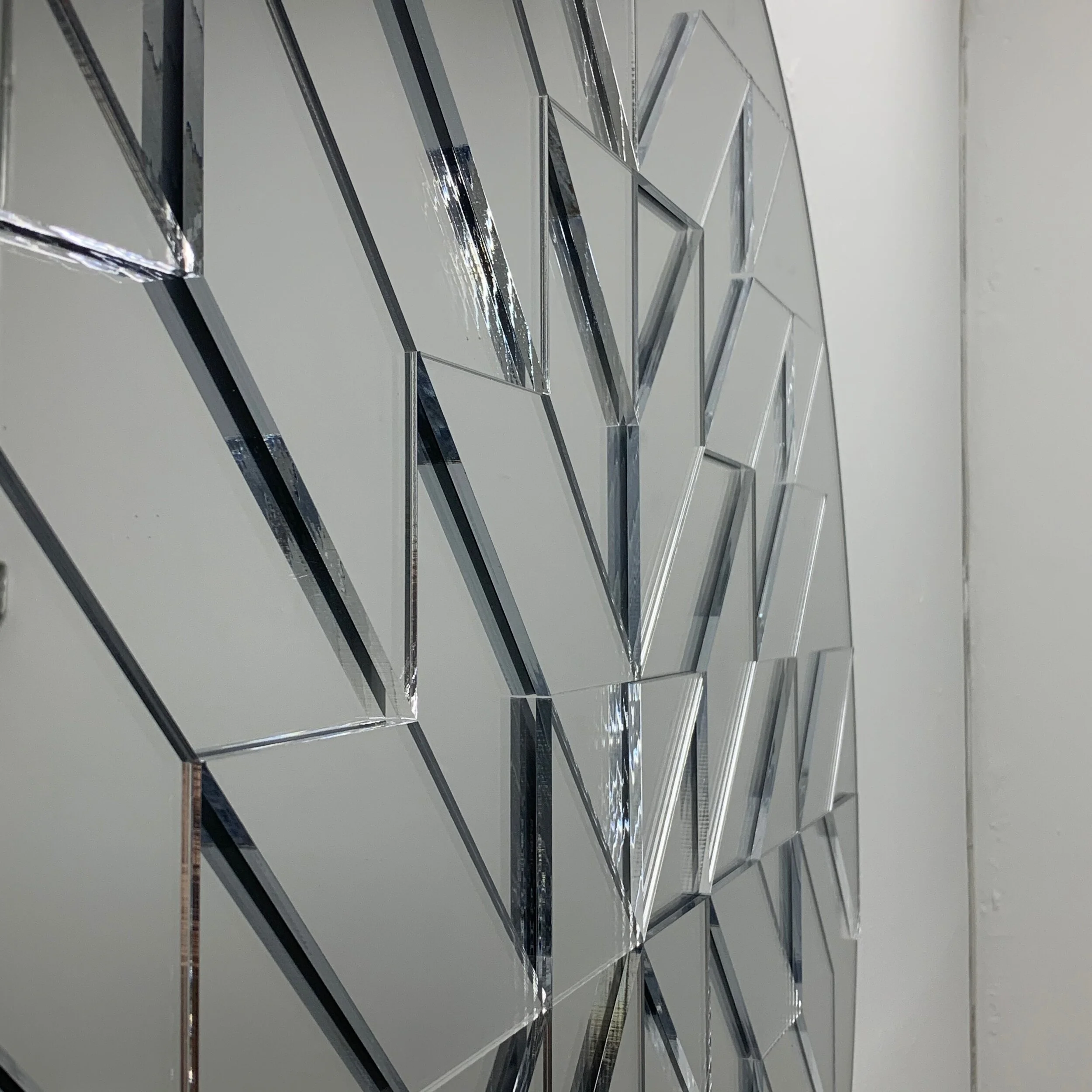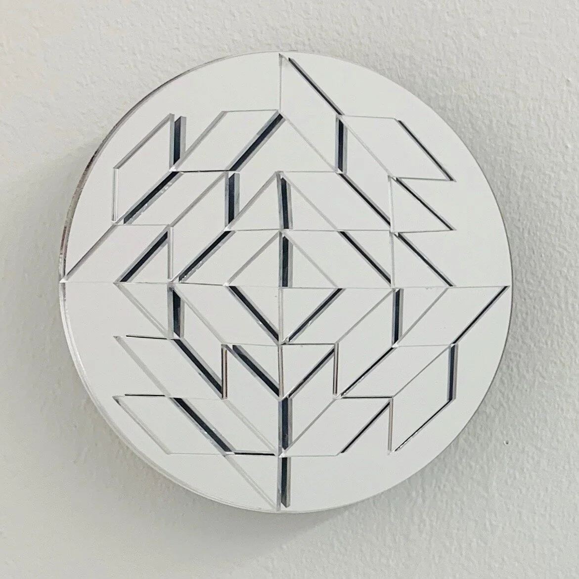 Working with mirrors and glass, I take the concepts and shapes from my sketches and paintings and making them sculptural.The surface changes depending on its environment, because it’s a reflection of where it’s placed. When the viewer is reflected in the piece, they’re actually part of it. I control the design, but the surface image is left to chance. The mirrored surfaces reflect images beyond my control.