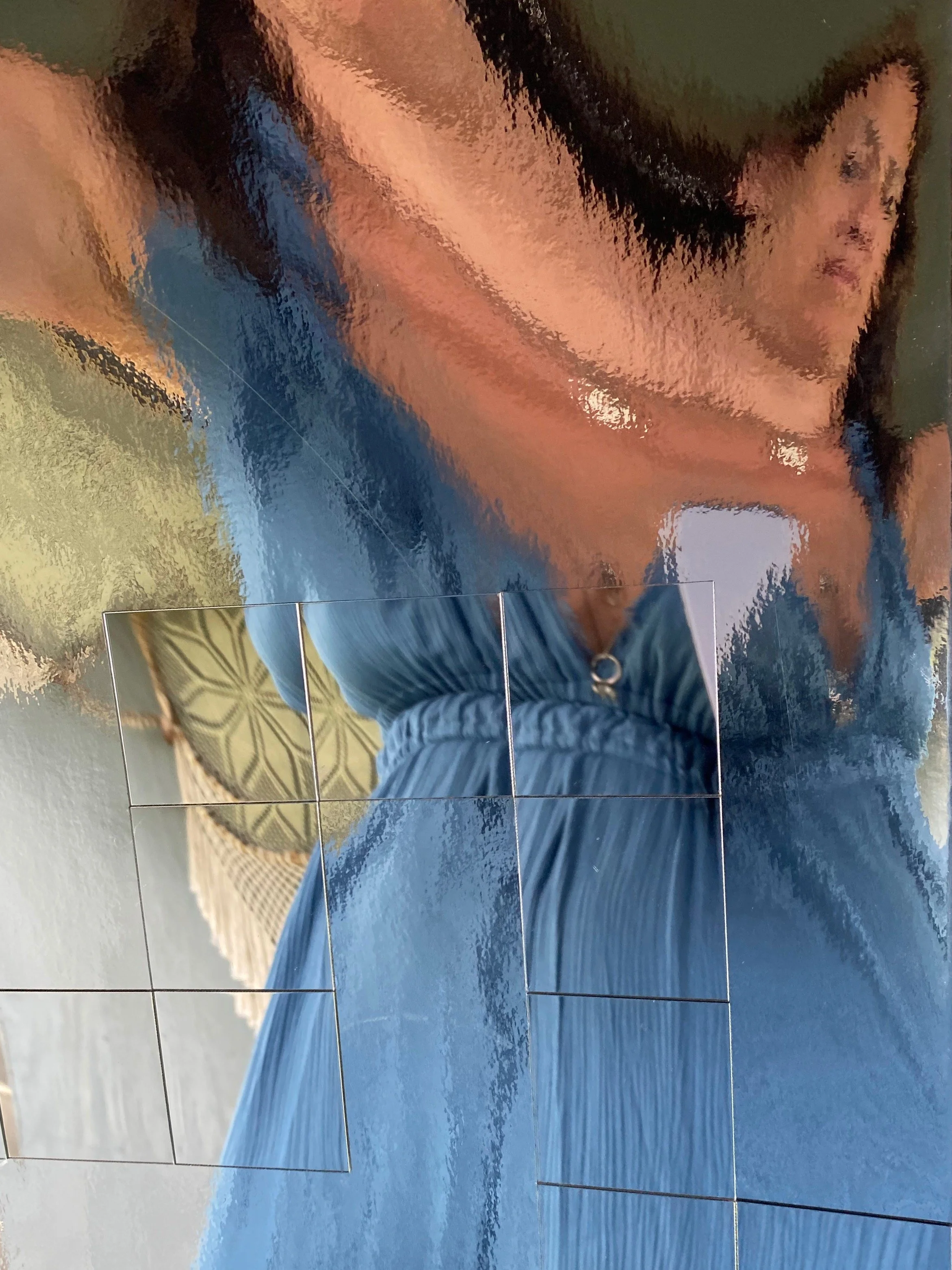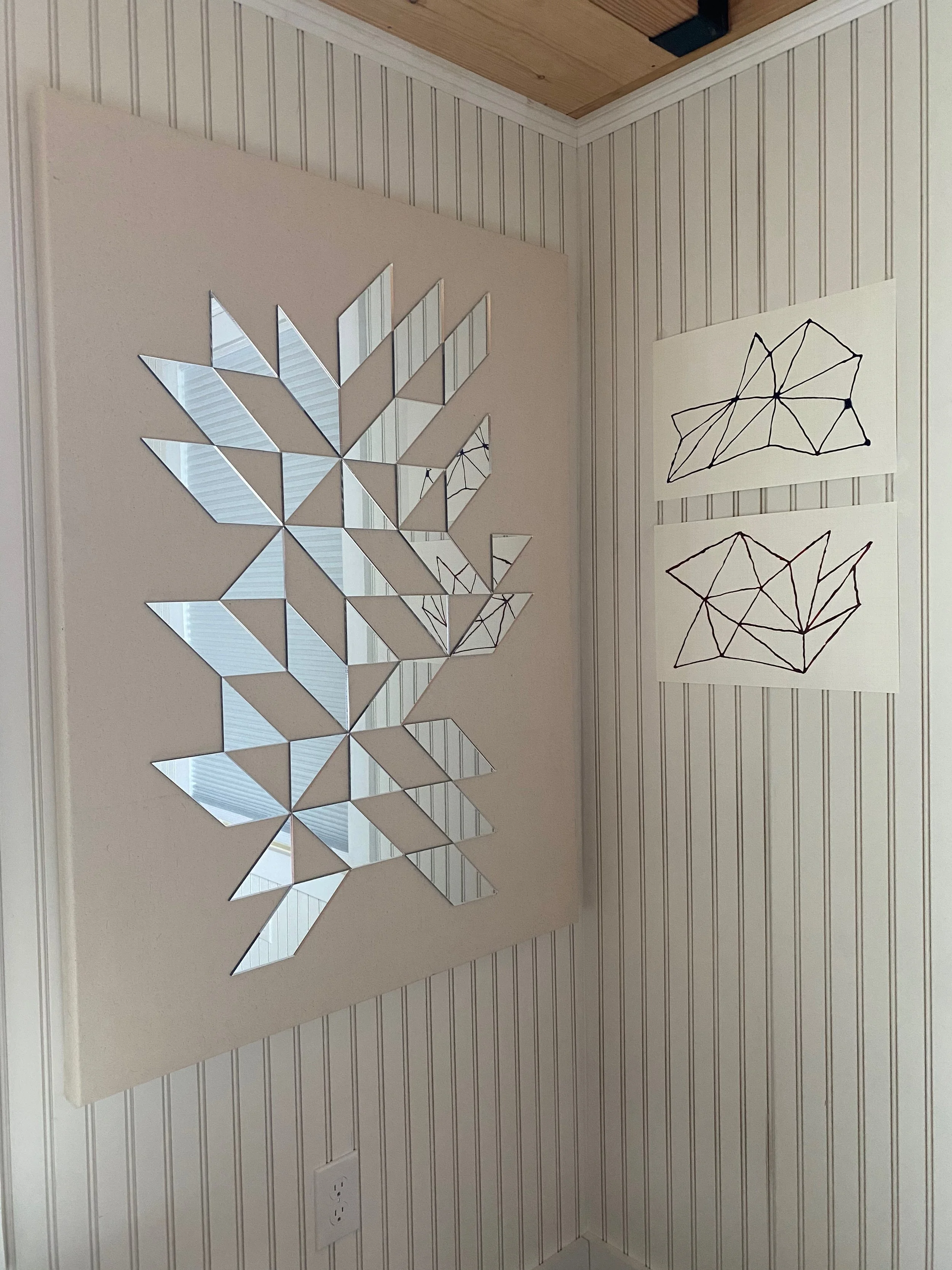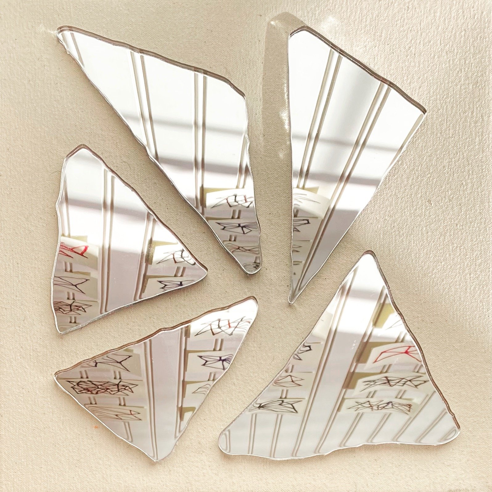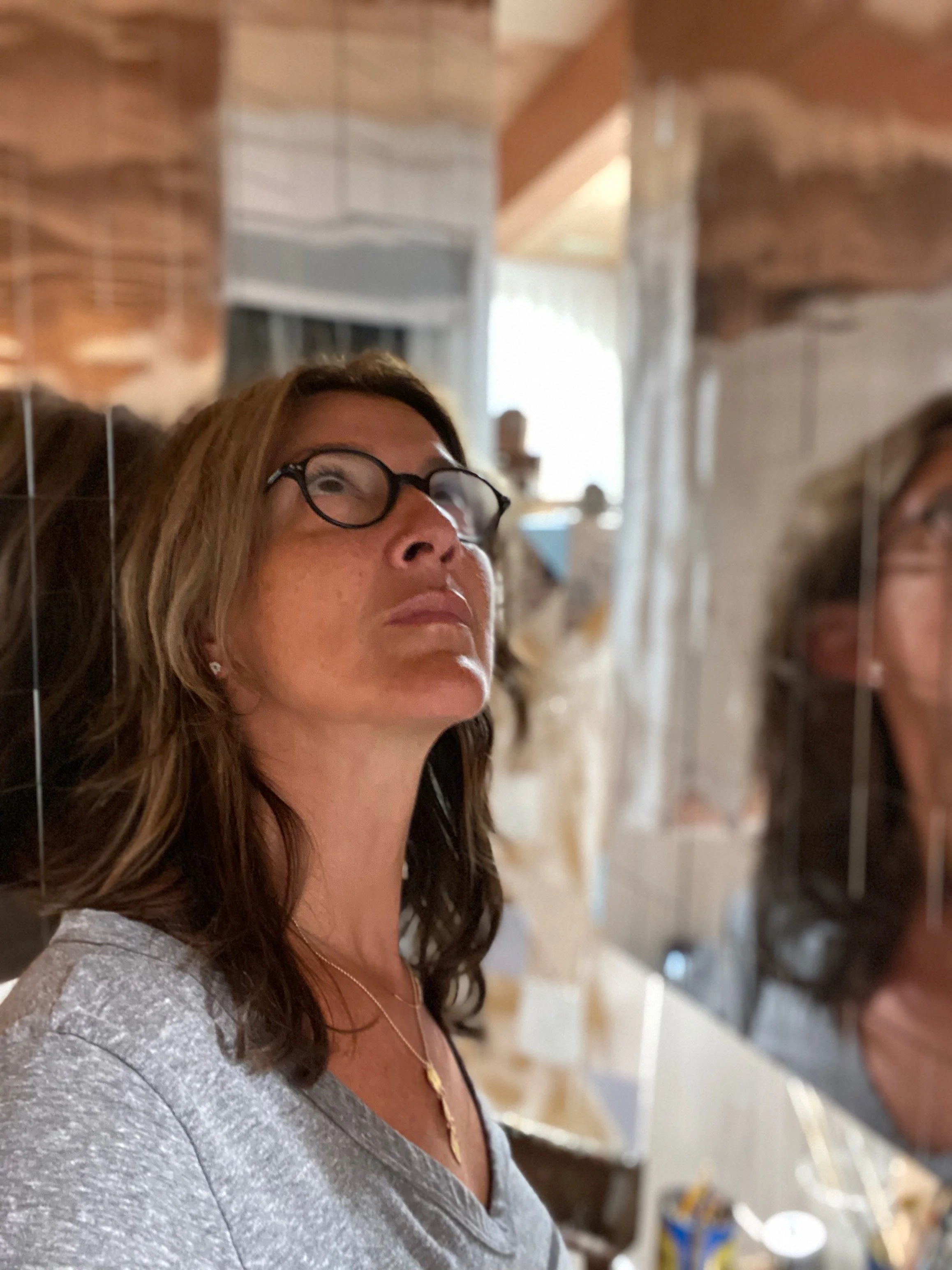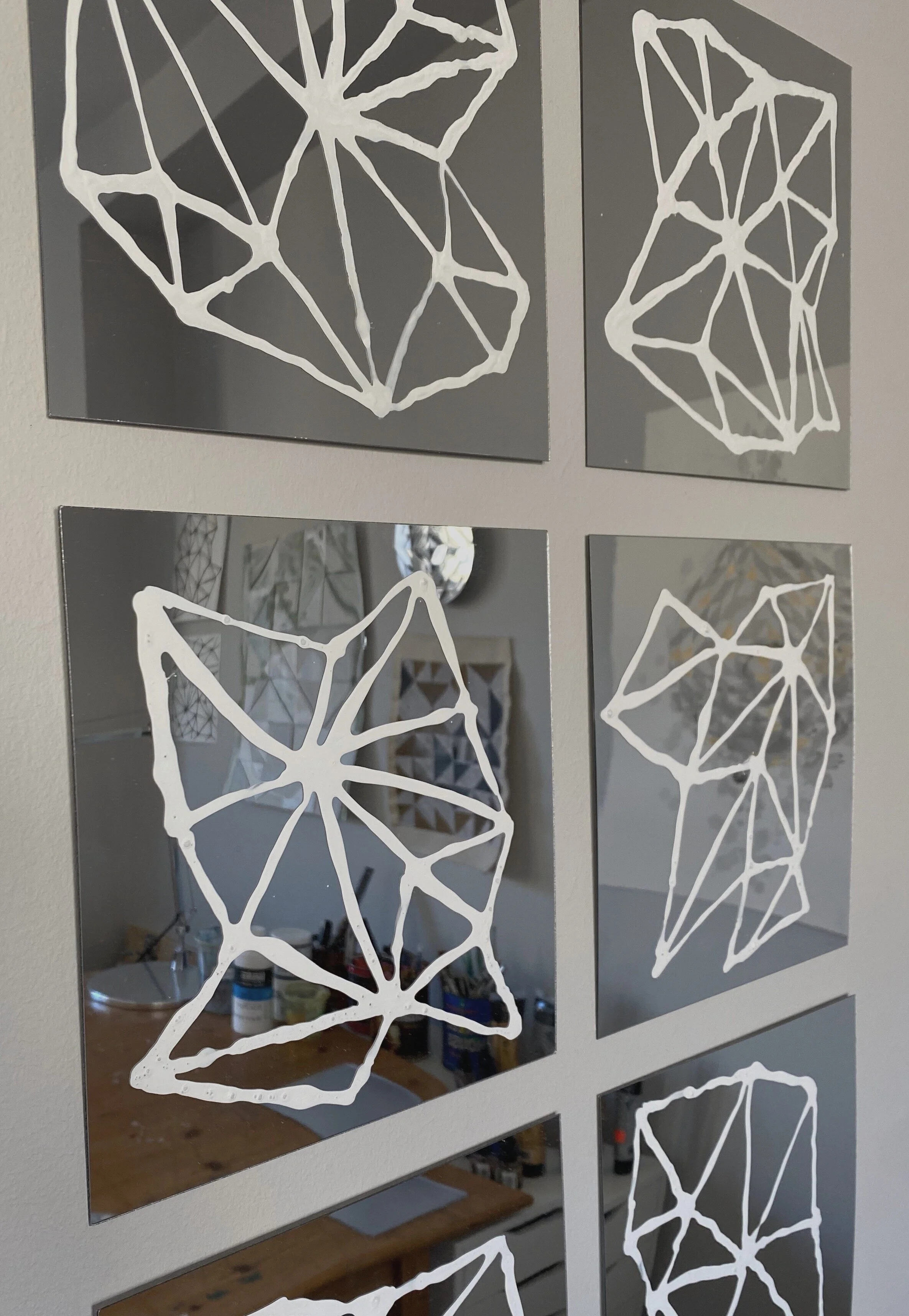 Working with mirrors and glass, I take the concepts and shapes from my sketches and paintings and making them sculptural.The surface changes depending on its environment, because it’s a reflection of where it’s placed. When the viewer is reflected in the piece, they’re actually part of it. I control the design, but the surface image is left to chance. The mirrored surfaces reflect images beyond my control.